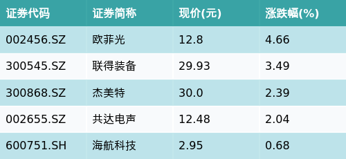 截至收盘,苹果概念主题涨跌幅最高的五只股票为:欧菲光(002456.SZ)、联得装备(300545.SZ)、杰美特(300868.SZ)、共达电声(002655.SZ)与海航科技(600751.SH)。详情见下表: