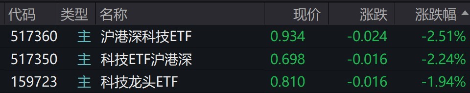 受盘面影响,沪港深科技相关ETF跌逾2%。