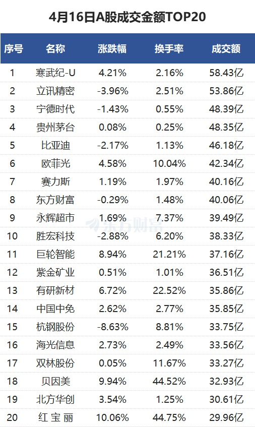 沪深两市成交额1.11万亿元,较上一交易日放量347亿元。个股方面,寒武纪当日成交58.43亿元。立讯精密当日成交53.86亿元。