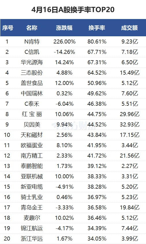 当天换手率最高的个股为N肯特,全天换手率80.61%。C信凯紧随其后,全天换手率67.71%。