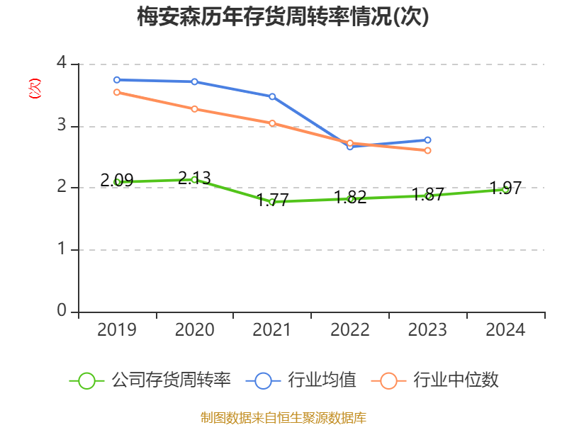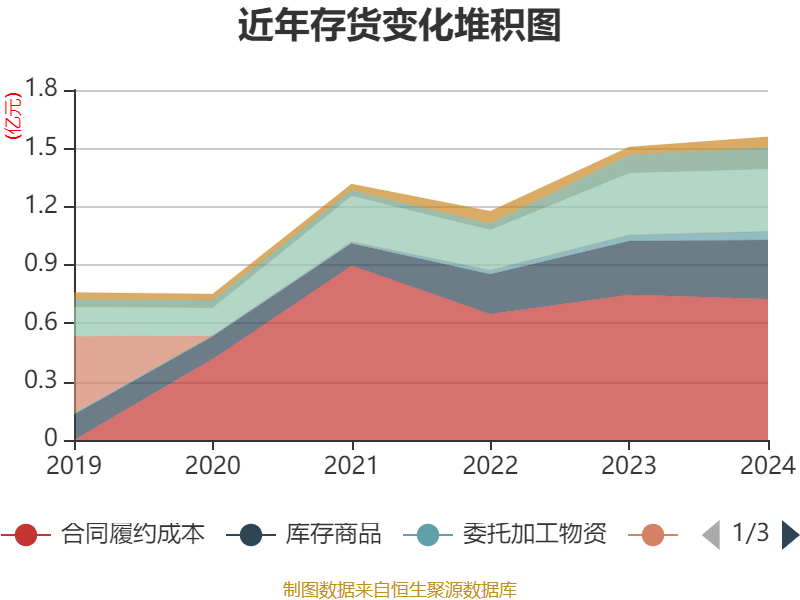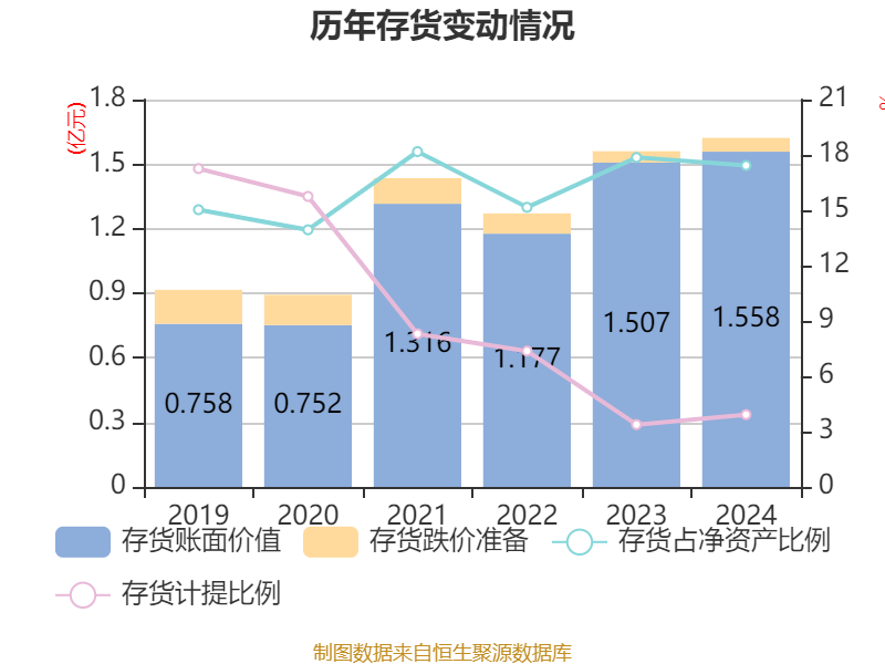 从存货变动来看,截至2024年末,公司存货账面价值为1.56亿元,占净资产的17.43%,较上年末增加509.82万元。其中,存货跌价准备为636.09万元,计提比例为3.92%。