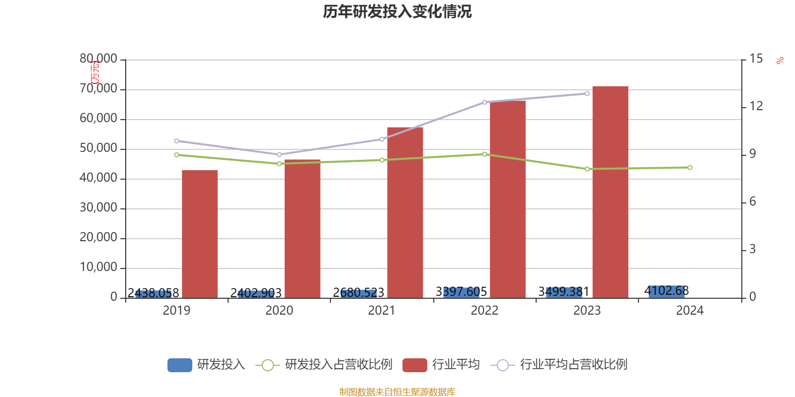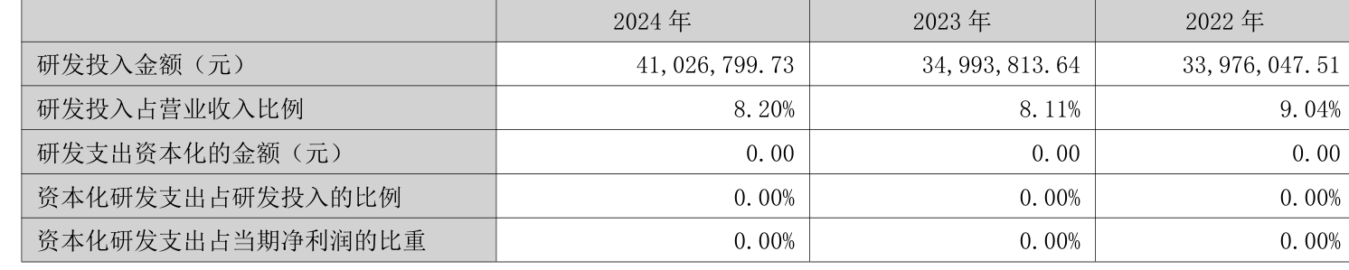 2024年全年,公司研发投入金额为4102.68万元,同比增长17.24%;研发投入占营业收入比例为8.2%,相比上年同期上升0.09个百分点。此外,公司全年研发投入资本化率为0%。