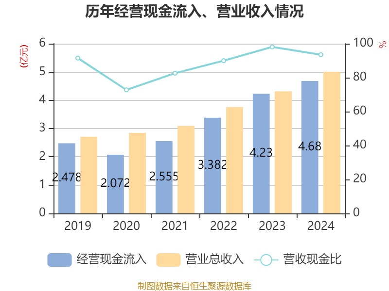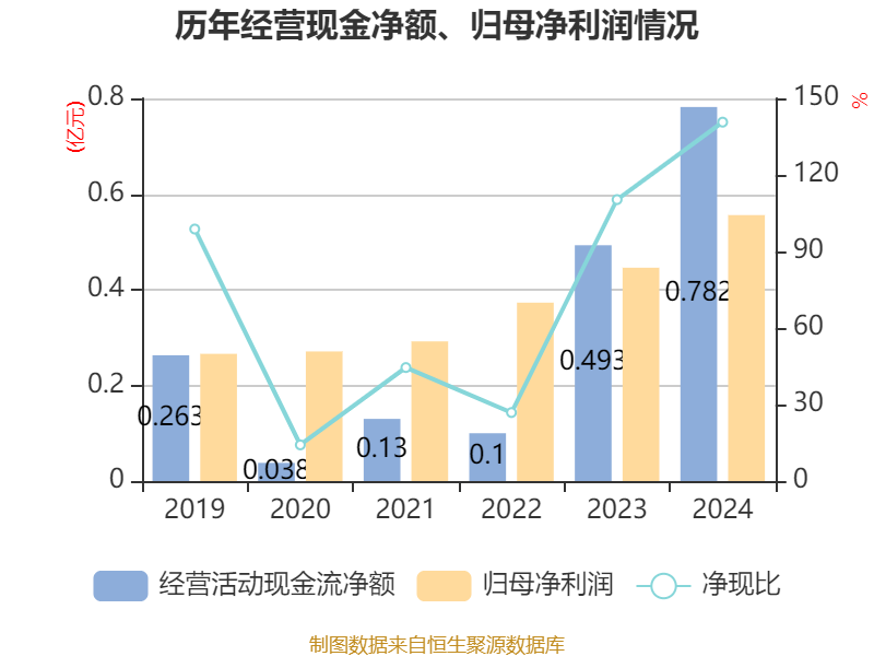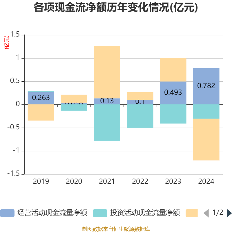 截至2024年,公司经营活动现金流净额为7820.95万元,同比增长58.76%;筹资活动现金流净额-9023.96万元,同比减少1.41亿元;投资活动现金流净额-3057.64万元,上年同期为-4121.67万元。