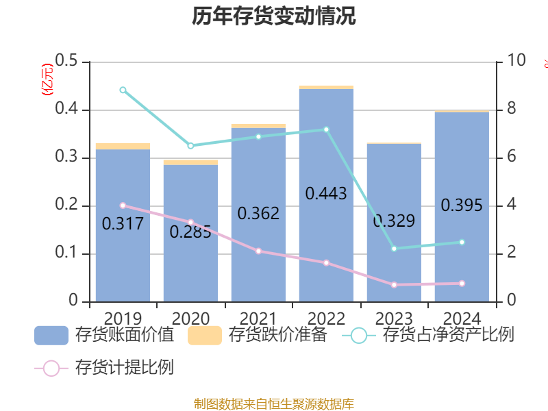 从存货变动来看,截至2024年末,公司存货账面价值为3948.46万元,占净资产的2.47%,较上年末增加654.58万元。其中,存货跌价准备为29.84万元,计提比例为0.75%。