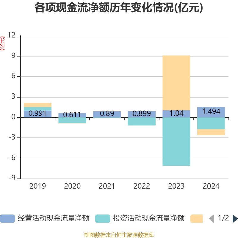 截至2024年,公司经营活动现金流净额为1.49亿元,同比增长43.6%;筹资活动现金流净额-8706.51万元,同比减少8.92亿元;投资活动现金流净额-1.75亿元,上年同期为-7.14亿元。