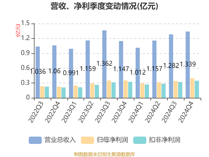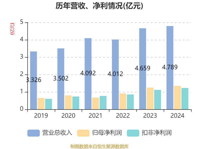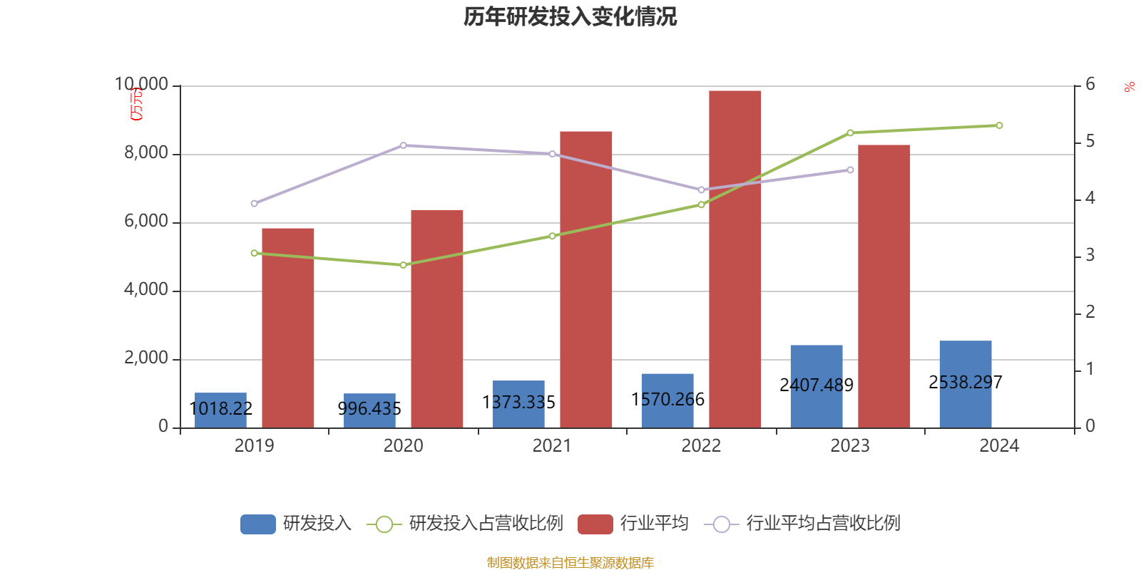 2024年全年,公司研发投入金额为2538.3万元,同比增长5.43%;研发投入占营业收入比例为5.3%,相比上年同期上升0.13个百分点。此外,公司全年研发投入资本化率为0%。