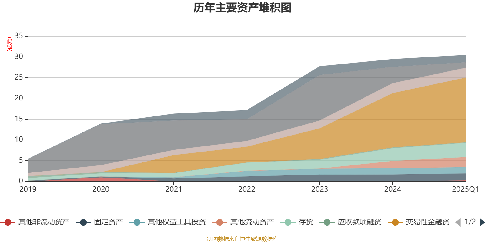 资产重大变化方面,截至2025年一季度末,公司货币资金较上年末减少66.8%,占公司总资产比重下降9.04个百分点;交易性金融资产合计较上年末增加19.42%,占公司总资产比重上升6.86个百分点;其他流动资产较上年末增加39.01%,占公司总资产比重上升2.04个百分点;其他非流动资产较上年末增加4117.01%,占公司总资产比重上升0.94个百分点。