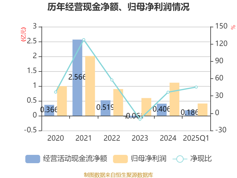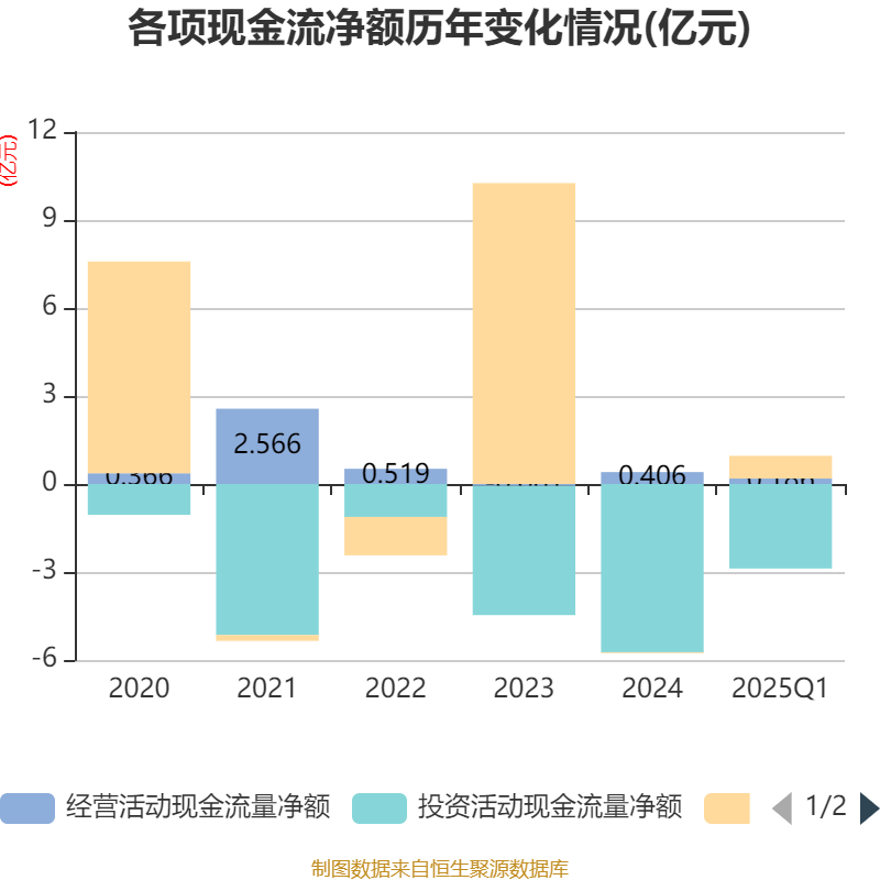 截至2025年一季度末,公司经营活动现金流净额为1862.08万元,同比下降35.7%;筹资活动现金流净额7728.01万元,同比增加1826.35万元;投资活动现金流净额-2.88亿元,上年同期为-3.55亿元。