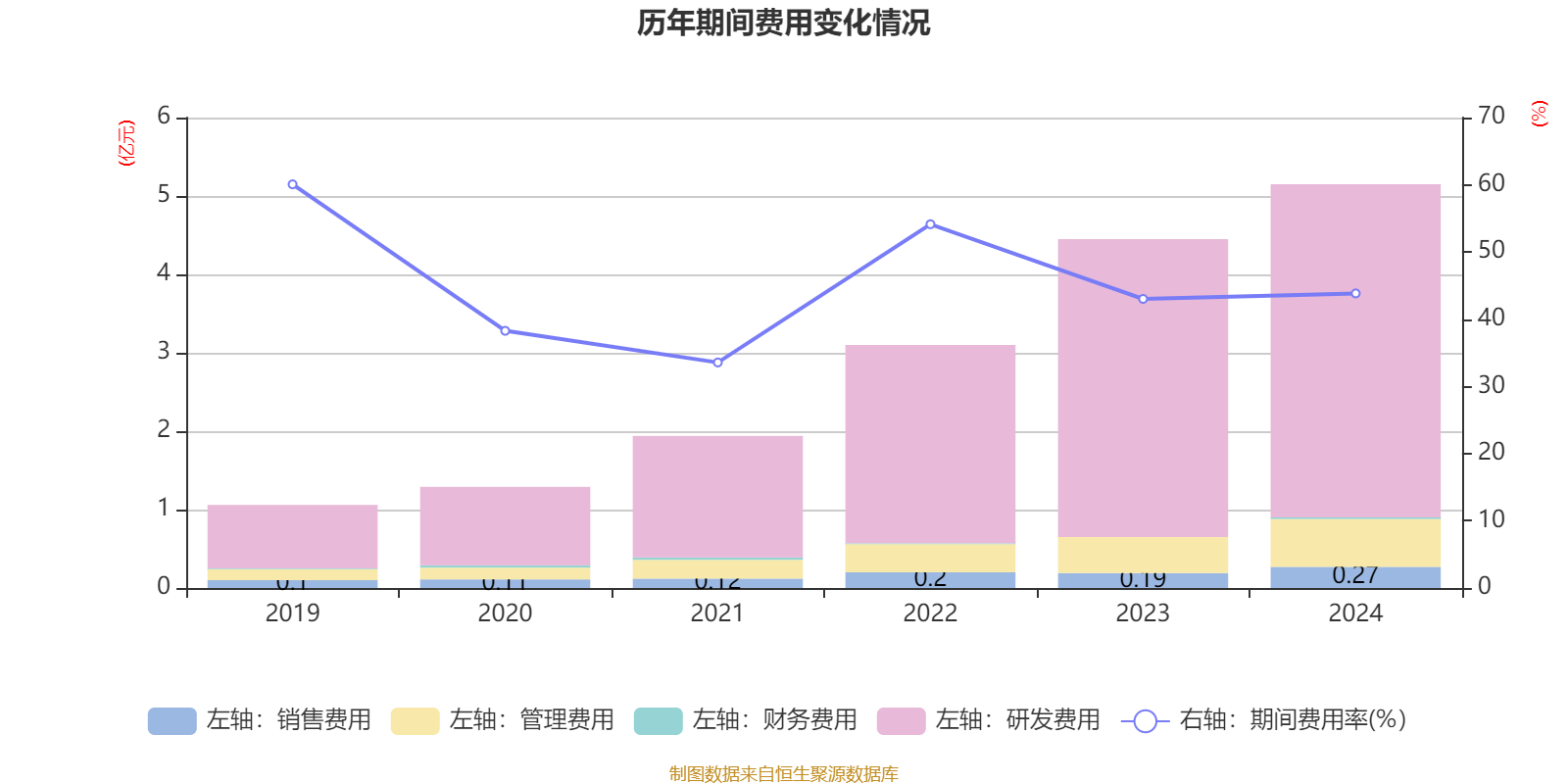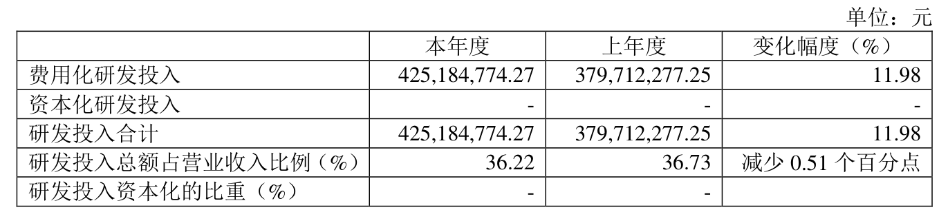 2024年全年,公司研发投入金额为4.25亿元,同比增长11.98%;研发投入占营业收入比例为36.22%,相比上年同期下降0.51个百分点。
