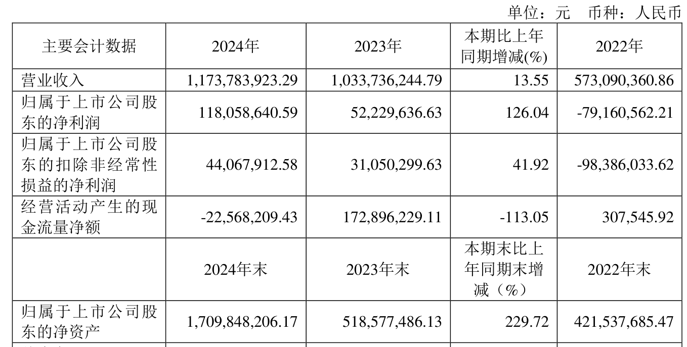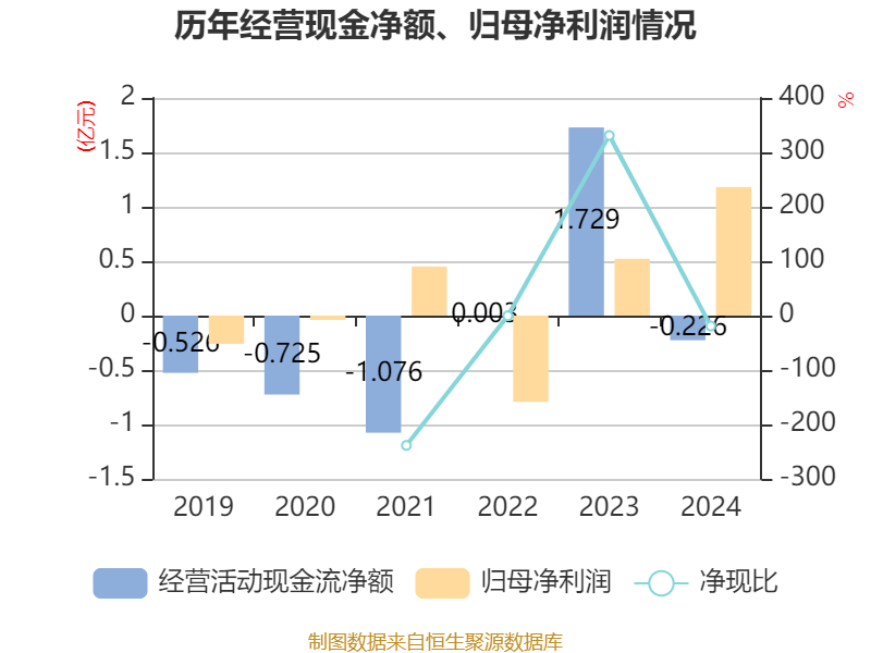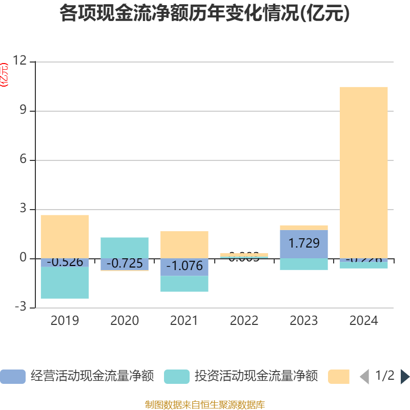 截至2024年,公司经营活动现金流净额为-2256.82万元,同比减少1.95亿元;筹资活动现金流净额10.44亿元,同比增加10.16亿元;投资活动现金流净额-3927.8万元,上年同期为-7134.88万元。