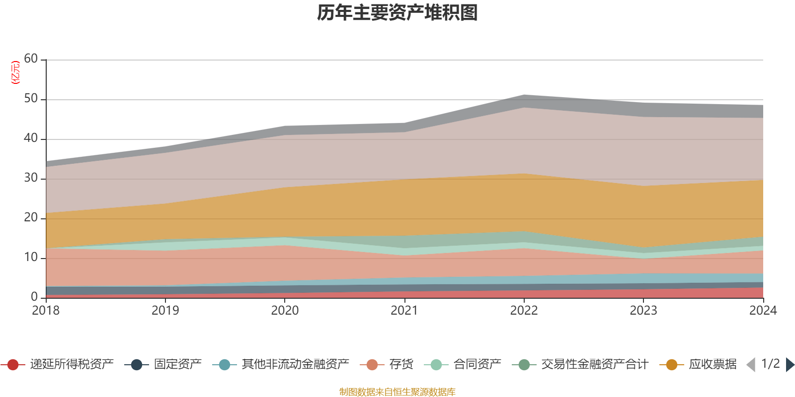资产重大变化方面,截至2024年末,公司存货较上年末增加58.37%,占公司总资产比重上升4.49个百分点;货币资金较上年末减少9.93%,占公司总资产比重下降3.11个百分点;应收票据及应收账款较上年末减少7.88%,占公司总资产比重下降2.13个百分点;交易性金融资产合计较上年末增加63.84%,占公司总资产比重上升1.89个百分点。