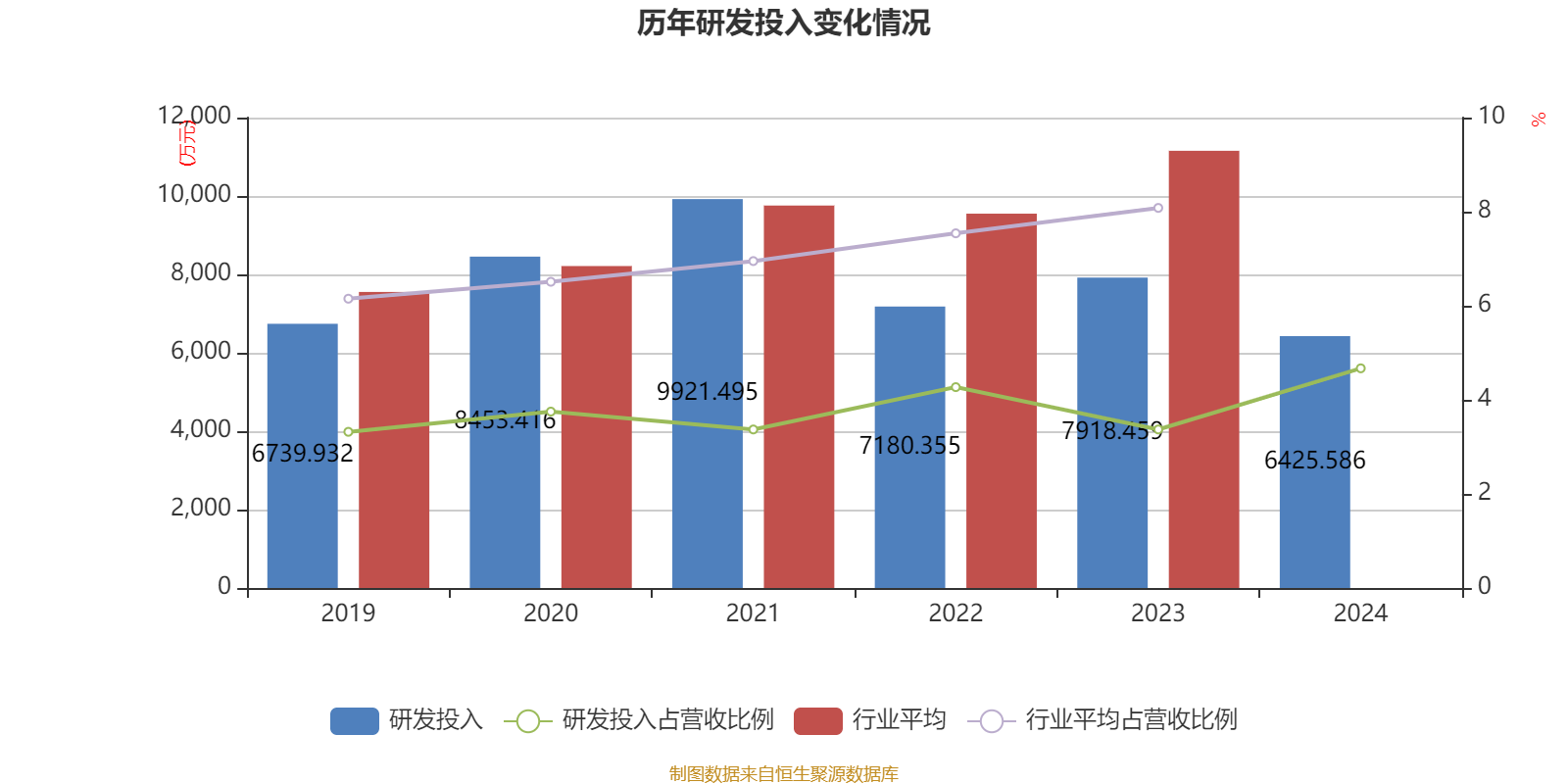 2024年全年,公司研发投入金额为6425.59万元,同比下降18.85%;研发投入占营业收入比例为4.67%,相比上年同期上升1.3个百分点。此外,公司全年研发投入资本化率为0%。