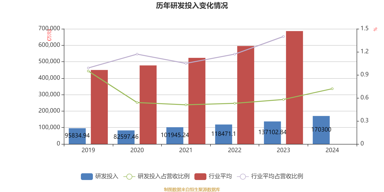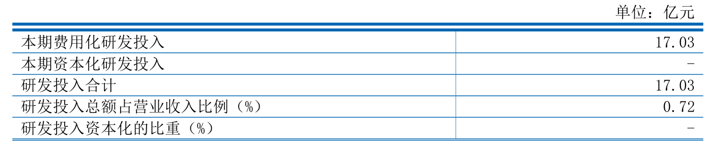 2024年全年,公司研发投入金额为17.03亿元,同比增长24.21%;研发投入占营业收入比例为0.72%,相比上年同期上升0.14个百分点。此外,公司全年研发投入资本化率为0%。