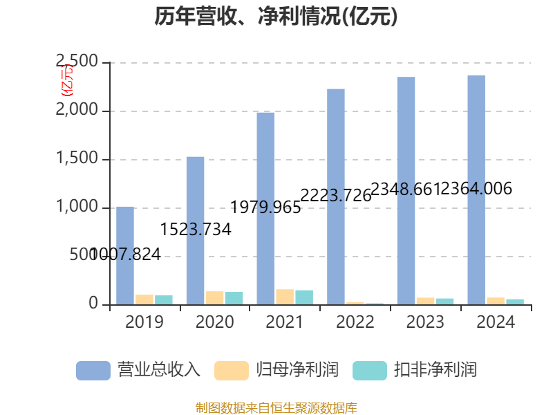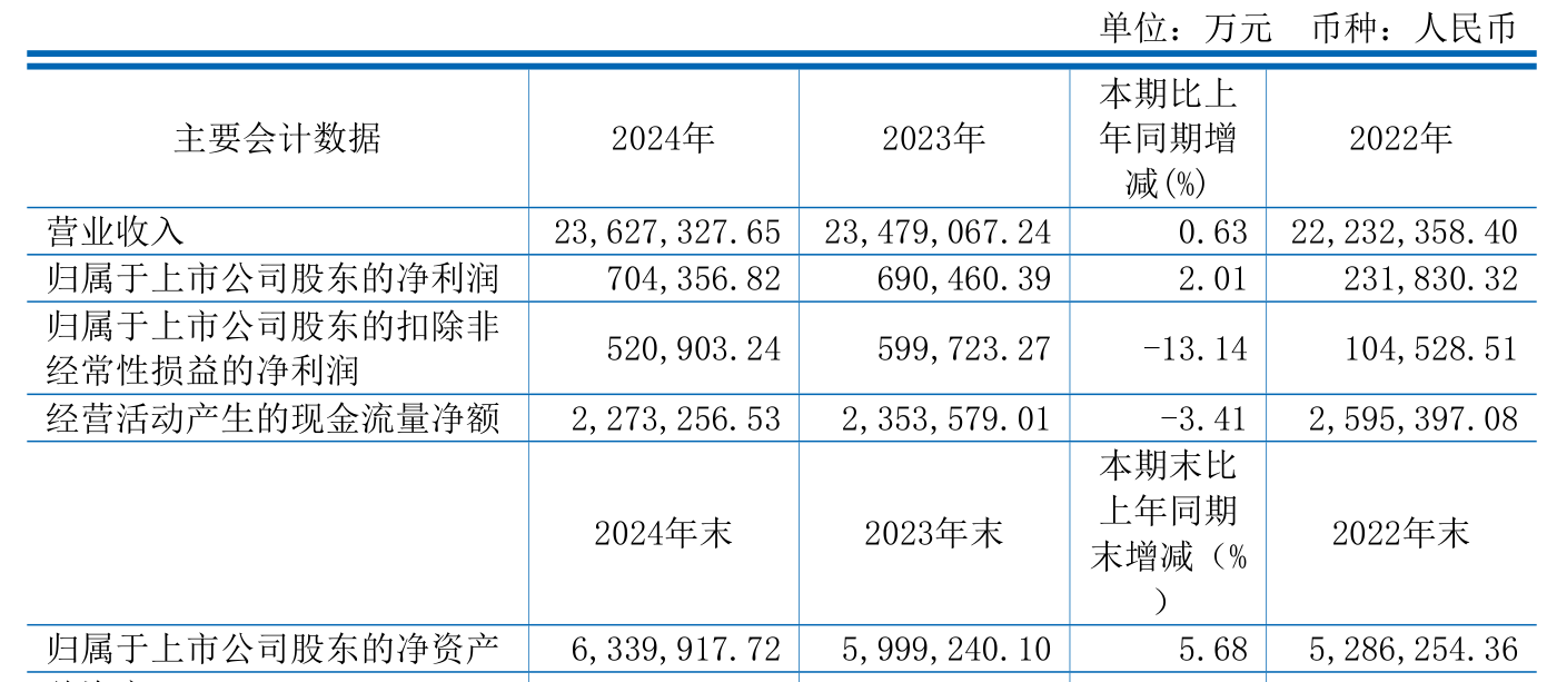 中证智能财讯恒力石化(600346)4月17日披露2024年年度报告。2024年,公司实现营业总收入2364.01亿元,同比增长0.65%;归母净利润70.44亿元,同比增长2.01%;扣非净利润52.09亿元,同比下降13.14%;经营活动产生的现金流量净额为227.33亿元,同比下降3.41%;报告期内,恒力石化基本每股收益为1.00元,加权平均净资产收益率为11.48%。公司2024年度分配预案为:拟向全体股东每10股派现4.5元(含税)。