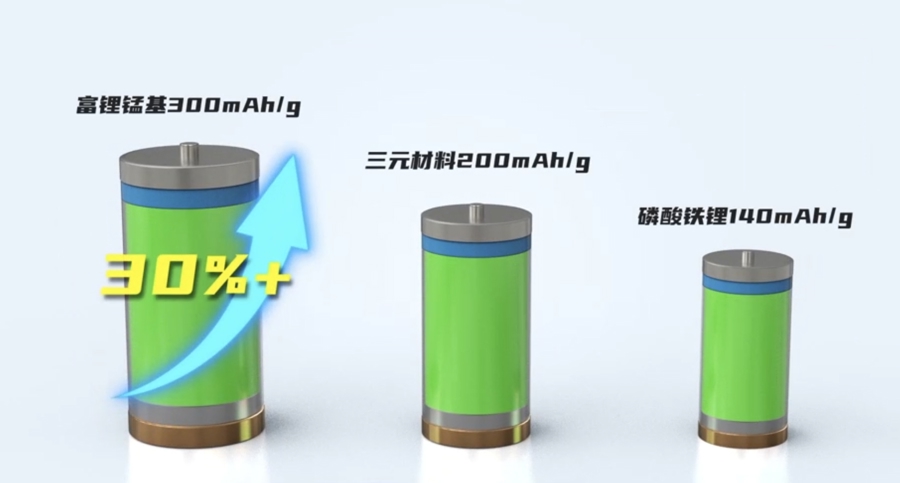 富锂锰基正极材料在克比容量上与商业化三元和磷酸铁锂材料的对比