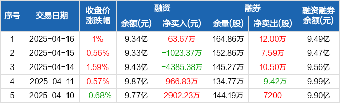 融资方面,当日融资买入4914.06万元,融资偿还4850.39万元,融资净买入63.67万元。融券方面,融券卖出14.39万股,融券偿还2.39万股,融券余量164.86万股,融券余额1495.28万元。融资融券余额合计9.49亿元。