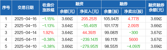 融资方面,当日融资买入477.93万元,融资偿还272.68万元,融资净买入205.25万元。融券方面,融券卖出6.24万股,融券偿还1.47万股,融券余量105.94万股,融券余额274.38万元。融资融券余额合计3.69亿元。