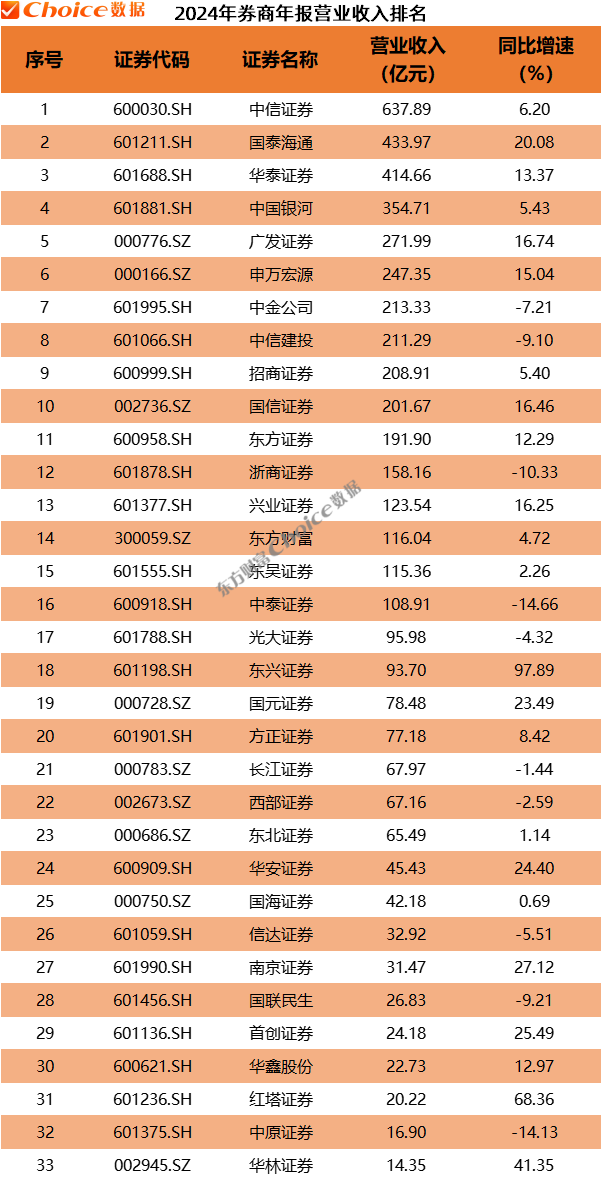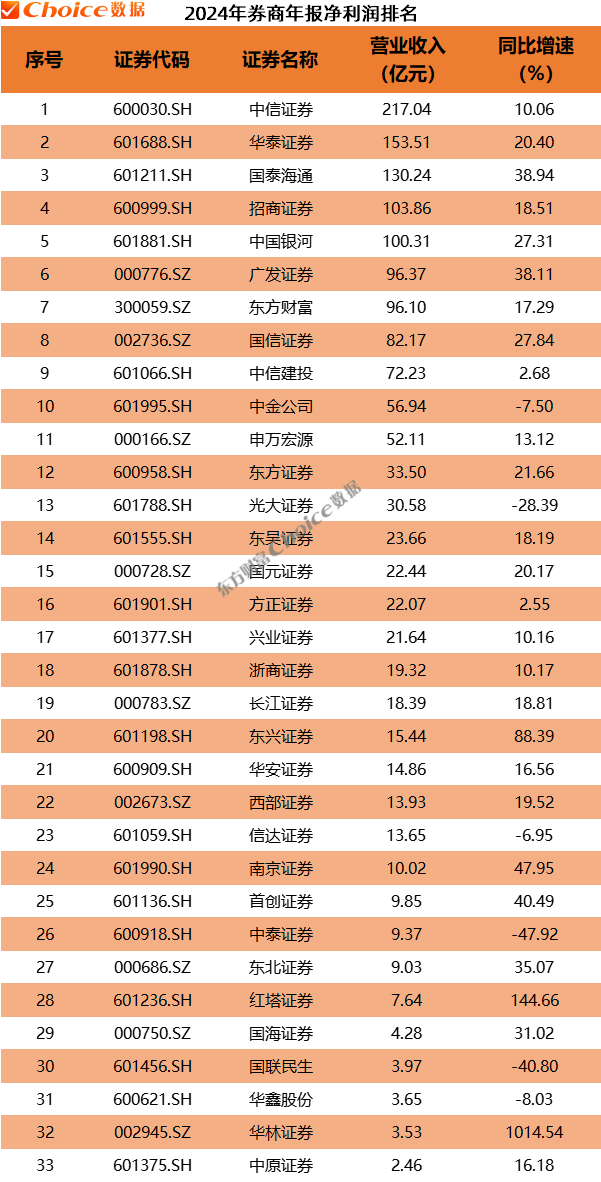 据Choice数据显示,33家上市券商中有7家披露了2024年经纪业务收入情况,其中排名前三的券商分别是华泰证券(169.39亿元)、中信证券(165.57亿元)和招商证券(102.33亿元),同比均实现增长。