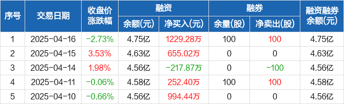 融资方面,当日融资买入2557.75万元,融资偿还1328.46万元,融资净买入1229.28万元。融券方面,融券卖出100股,融券偿还0股,融券余量100股,融券余额1712元。融资融券余额合计4.75亿元。