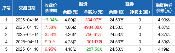 融资方面,当日融资买入8042.71万元,融资偿还7708.64万元,融资净买入334.07万元,连续4日净买入累计7070.74万元。融券方面,融券卖出0股,融券偿还0股,融券余量24.53万股,融券余额129.52万元。融资融券余额合计4.9亿元。
