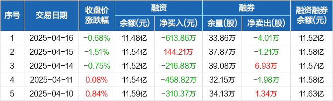 融资方面,当日融资买入791.58万元,融资偿还1405.44万元,融资净偿还613.86万元。融券方面,融券卖出2.62万股,融券偿还6.63万股,融券余量33.86万股,融券余额395.15万元。融资融券余额合计11.52亿元。