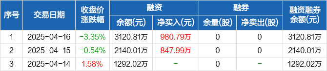 融资方面,当日融资买入1871.71万元,融资偿还890.92万元,融资净买入980.79万元。融券方面,融券卖出0股,融券偿还0股,融券余量0股,融券余额0元。融资融券余额合计3120.81万元。