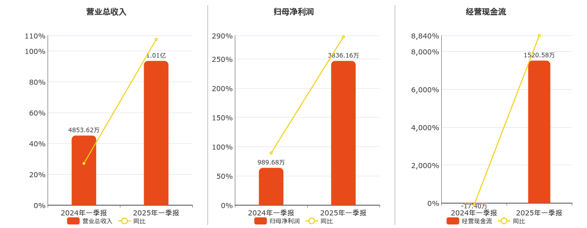公司营业总收入为1.01亿元。归母净利润为3836.16万元。经营活动现金净流入为1520.58万元。