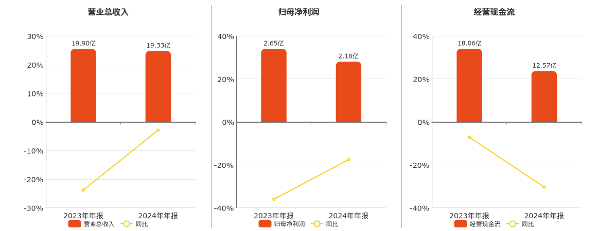 公司营业总收入为19.33亿元,较去年同报告期营业总收入减少5755.02万元,同比较去年同期下降2.89%。归母净利润为2.18亿元,较去年同报告期归母净利润减少4656.54万元,同比较去年同期下降17.59%。经营活动现金净流入为12.57亿元,较去年同报告期经营活动现金净流入减少5.49亿元,同比较去年同期下降30.39%。