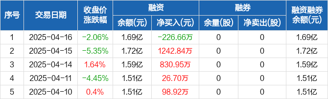融资方面,当日融资买入1116.9万元,融资偿还1343.56万元,融资净偿还226.66万元。融券方面,融券卖出0股,融券偿还0股,融券余量0股,融券余额0元。融资融券余额合计1.69亿元。