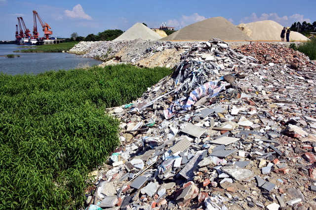 图为某地大量建筑垃圾被堆放在河边。摄影/章轲