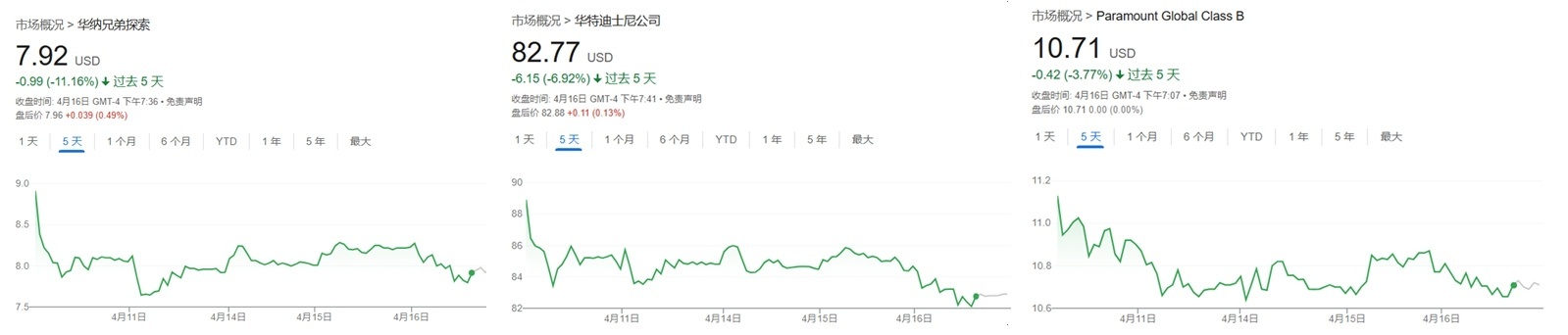 华纳兄弟探索、华特迪士尼、派拉蒙全球等知名美国电影公司股价于低位水平内再度暴跌。