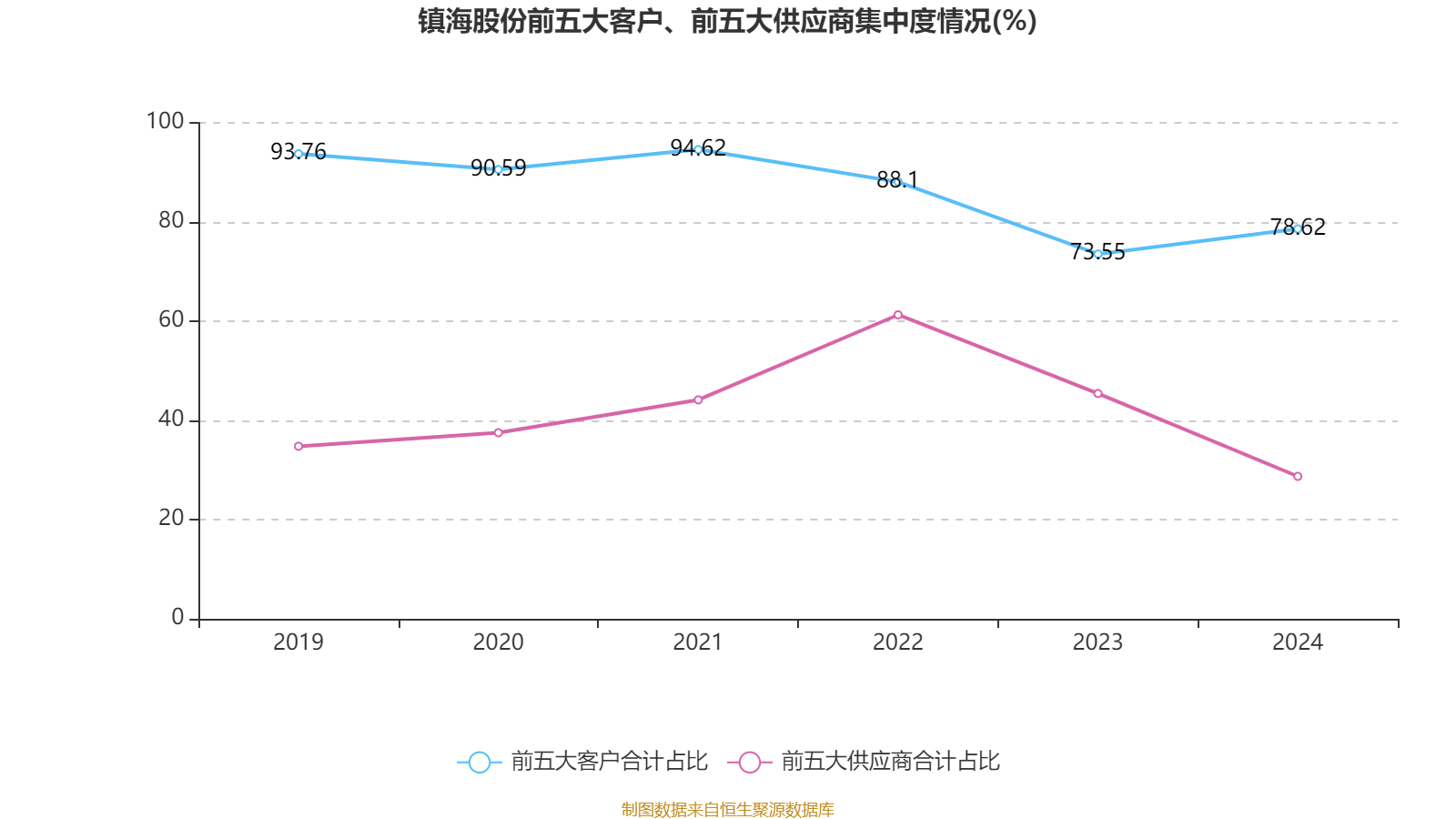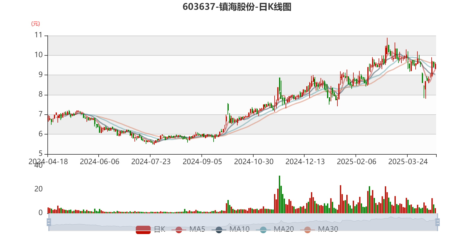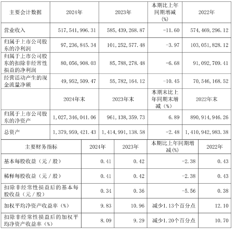 中证智能财讯镇海股份(603637)4月18日披露2024年年度报告。2024年,公司实现营业总收入5.18亿元,同比下降11.60%;归母净利润9723.68万元,同比下降3.97%;扣非净利润8005.69万元,同比下降6.68%;经营活动产生的现金流量净额为4995.25万元,同比下降10.45%;报告期内,镇海股份基本每股收益为0.41元,加权平均净资产收益率为9.83%。公司2024年度分配预案为:拟向全体股东每10股派现2元(含税)。