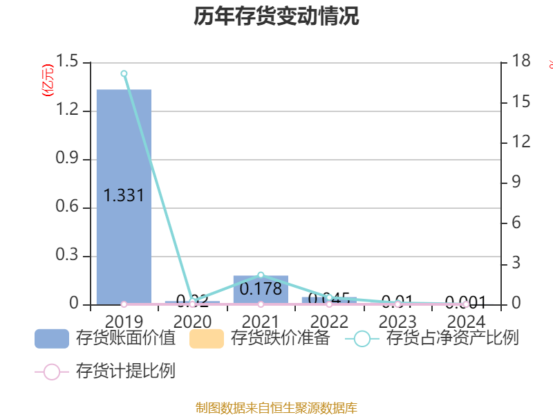 从存货变动来看,截至2024年末,公司存货账面价值为13.8万元,占净资产的0.01%,较上年末减少81.97万元。公司本期没有计提存货跌价准备。