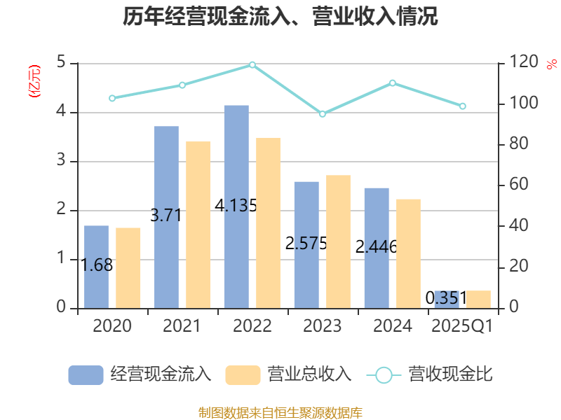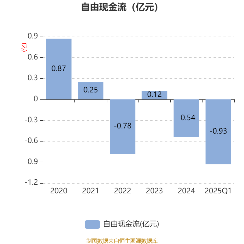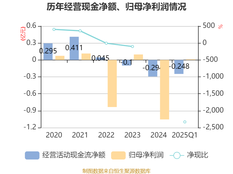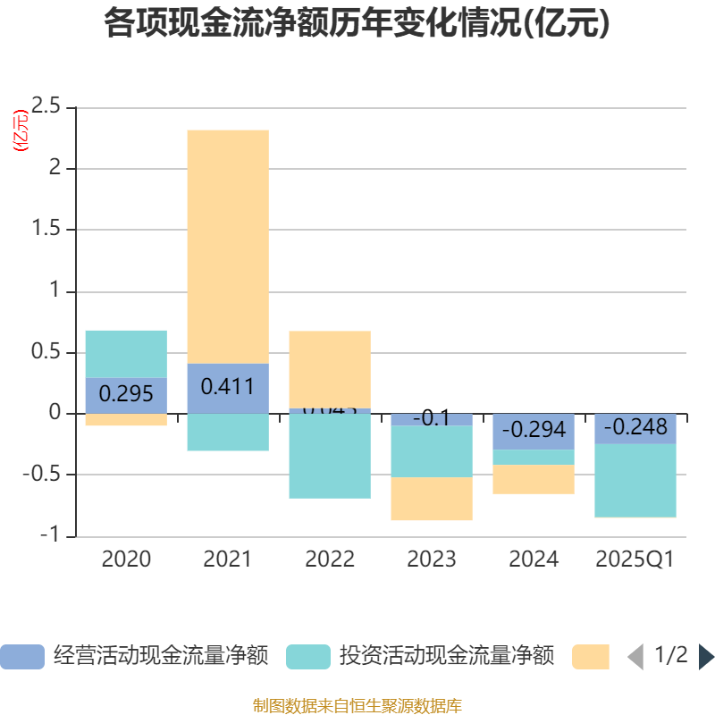 截至2025年一季度末,公司经营活动现金流净额为-2479.69万元,同比减少1453.55万元;筹资活动现金流净额-44.85万元,同比增加2107.64元;投资活动现金流净额-5982.66万元,上年同期为-421.32万元。