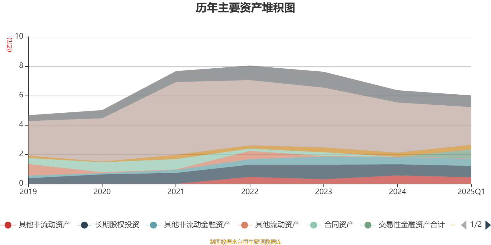 资产重大变化方面,截至2025年一季度末,公司货币资金较上年末减少24.96%,占公司总资产比重下降10.98个百分点;交易性金融资产合计占公司总资产的9.99%,上年末为0;其他非流动资产较上年末减少22.58%,占公司总资产比重下降1.61个百分点;长期股权投资较上年末增加2.81%,占公司总资产比重上升1.05个百分点。