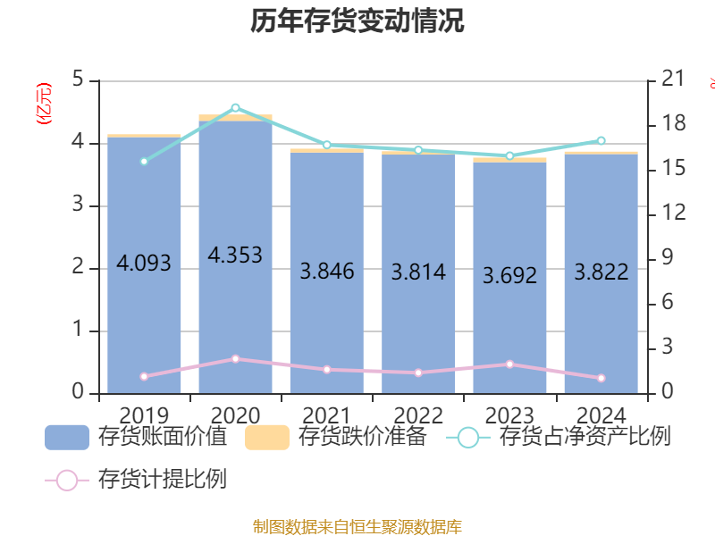 从存货变动来看,截至2024年末,公司存货账面价值为3.82亿元,占净资产的16.95%,较上年末增加1302.41万元。其中,存货跌价准备为384.99万元,计提比例为1%。