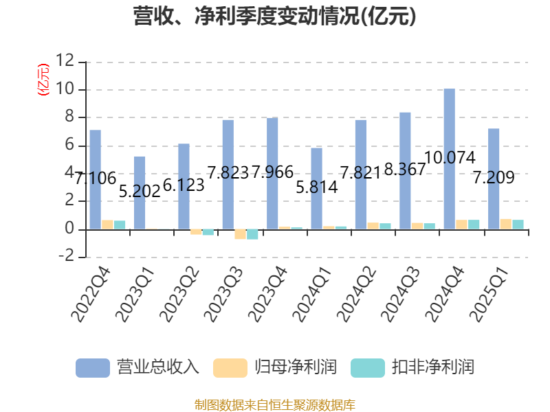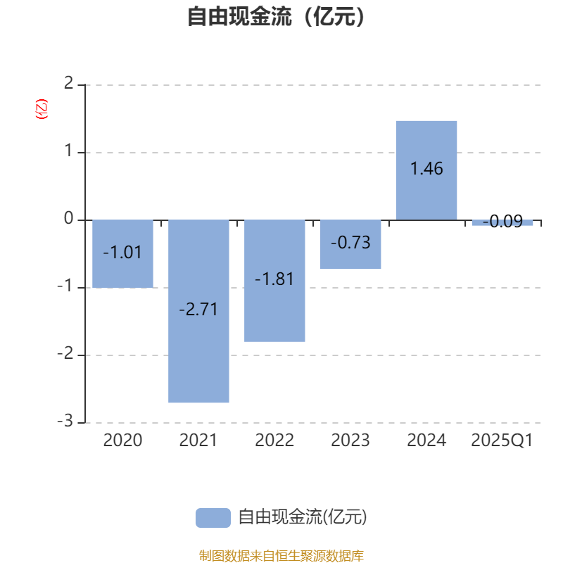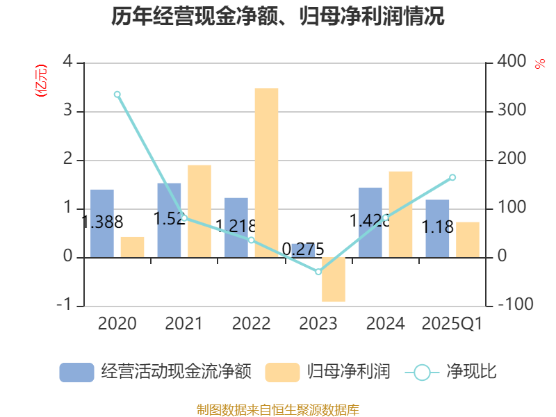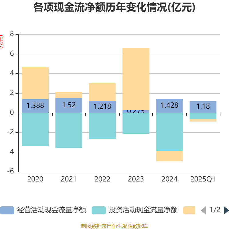 截至2025年一季度末,公司经营活动现金流净额为1.18亿元,同比增加1.78亿元;筹资活动现金流净额-2412.76万元,同比增加1904.13万元;投资活动现金流净额-6475.52万元,上年同期为-1255.53万元。