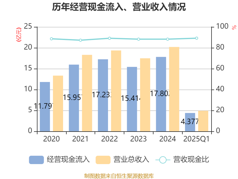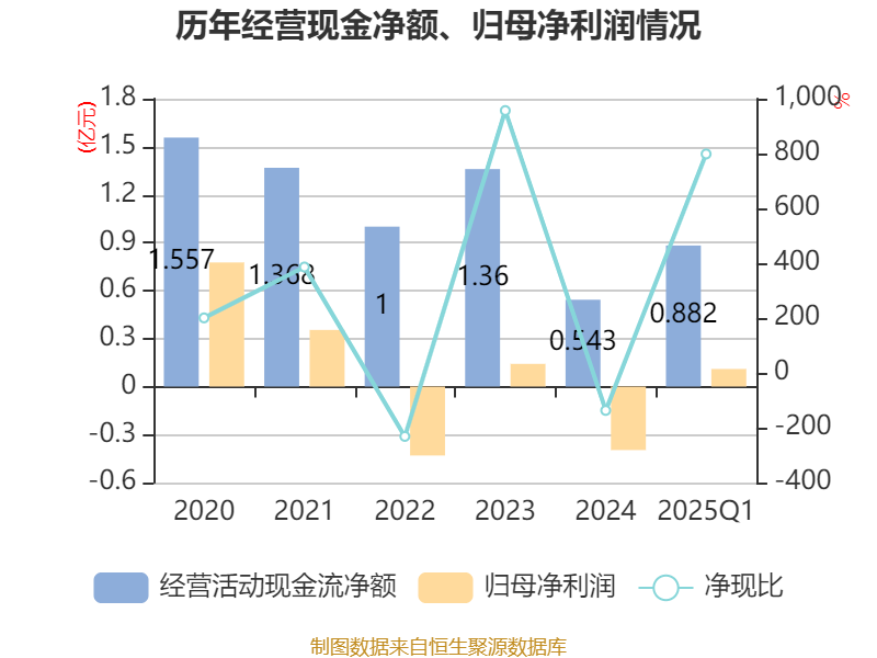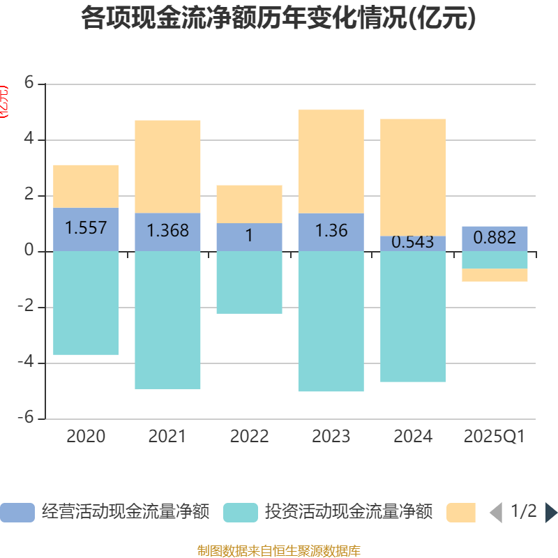 截至2025年一季度末,公司经营活动现金流净额为8817.58万元,同比增长89.19%;筹资活动现金流净额-4600.76万元,同比减少1.25亿元;投资活动现金流净额-6312.62万元,上年同期为-1.42亿元。