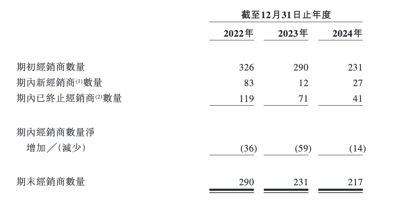 相比2024年末的217个加盟商,2021-2023年公司经销商数量分别为326家、290家、231家,2024年新增27家经销商、终止41家,2023年新增12家、终止71家,2022年新增83家、终止合作119家。