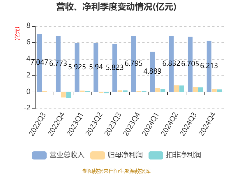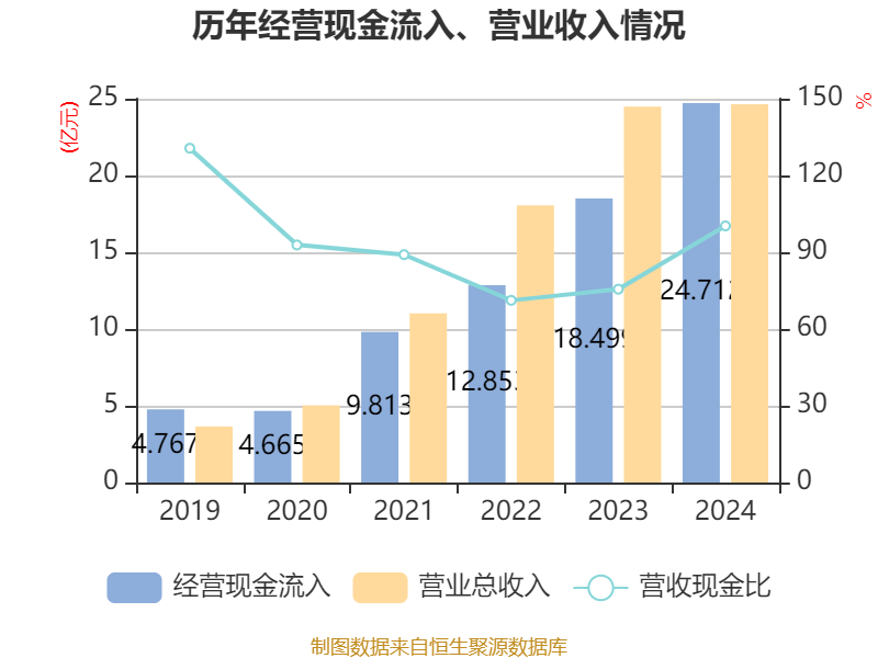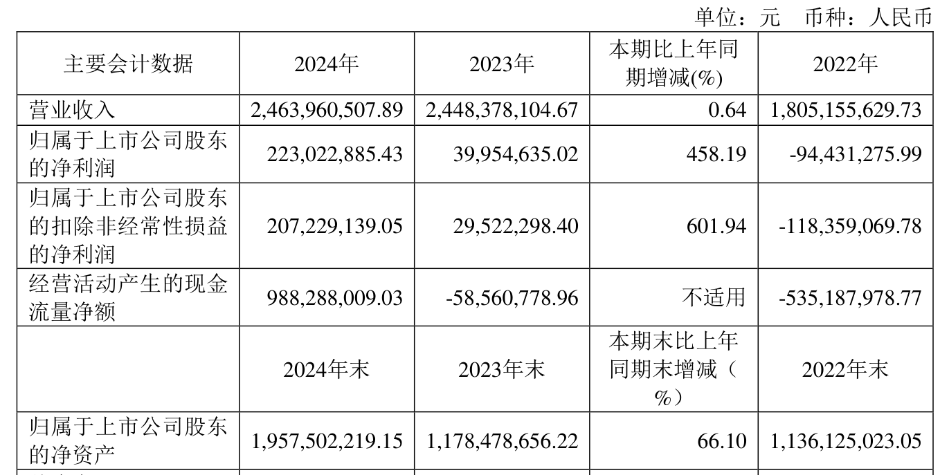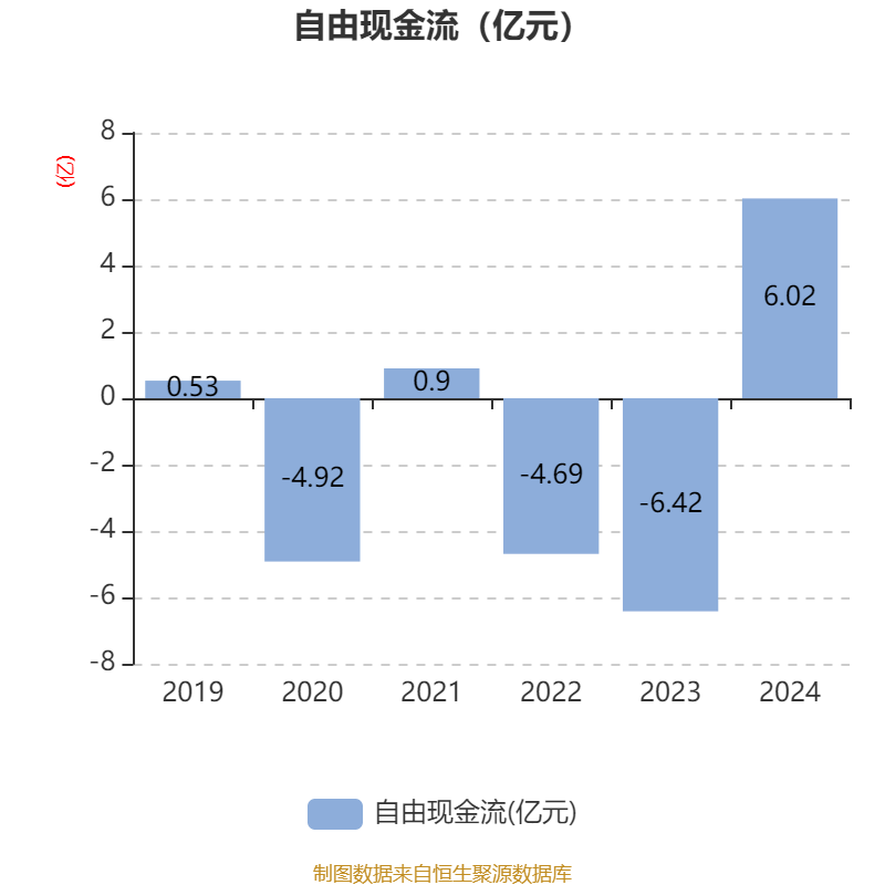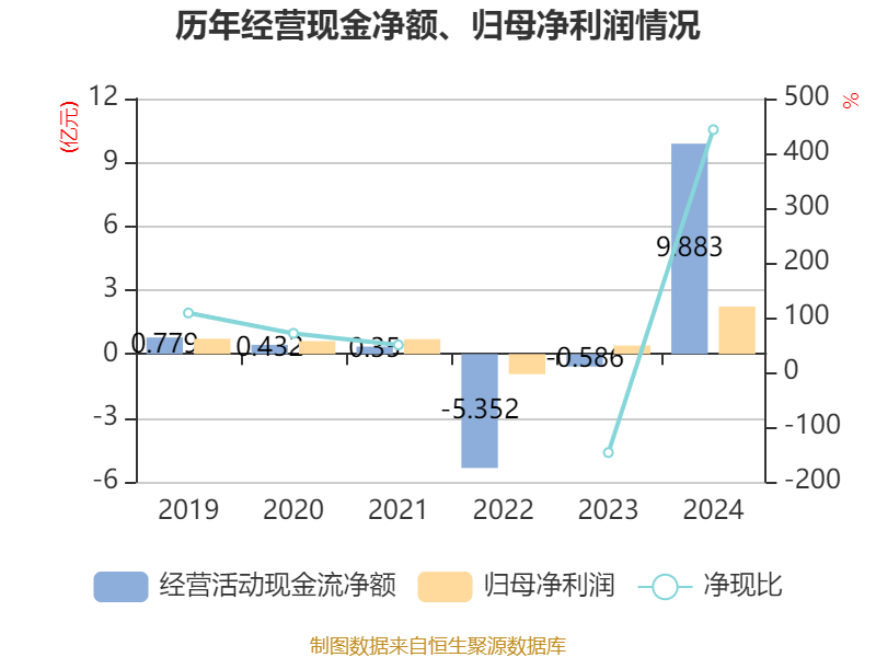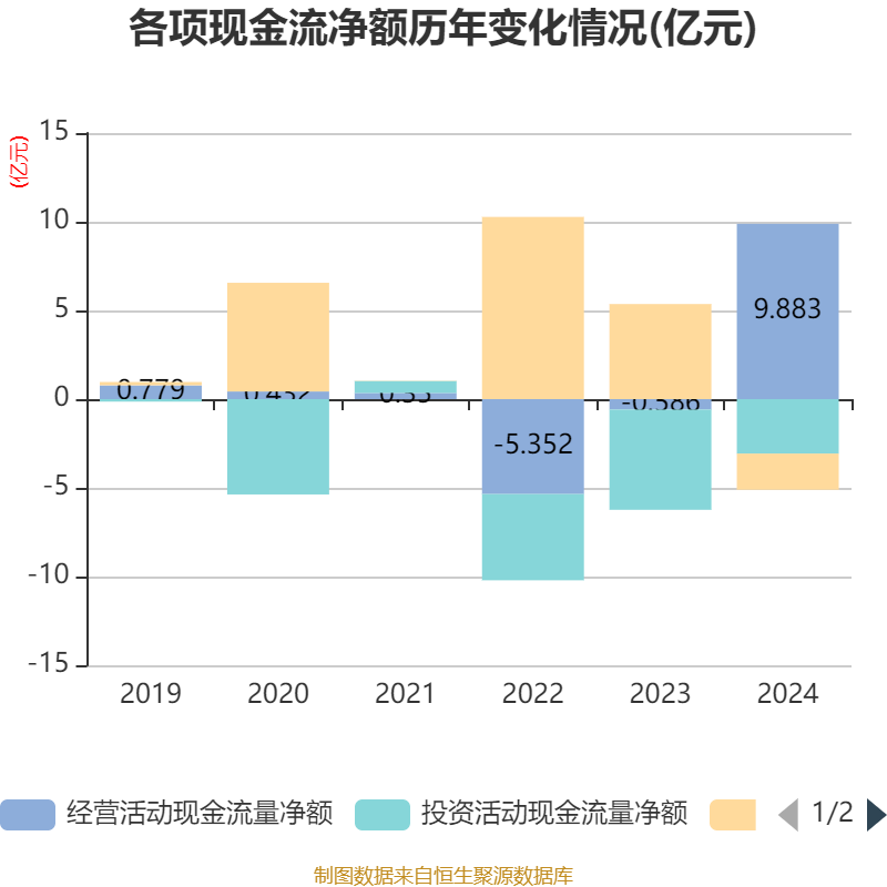 截至2024年,公司经营活动现金流净额为9.88亿元,同比增加10.47亿元;筹资活动现金流净额-2.04亿元,同比减少7.4亿元;投资活动现金流净额-3.07亿元,上年同期为-5.65亿元。
