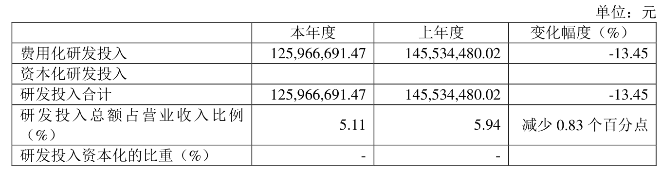 2024年全年,公司研发投入金额为1.26亿元,同比下降13.45%;研发投入占营业收入比例为5.11%,相比上年同期下降0.83个百分点。