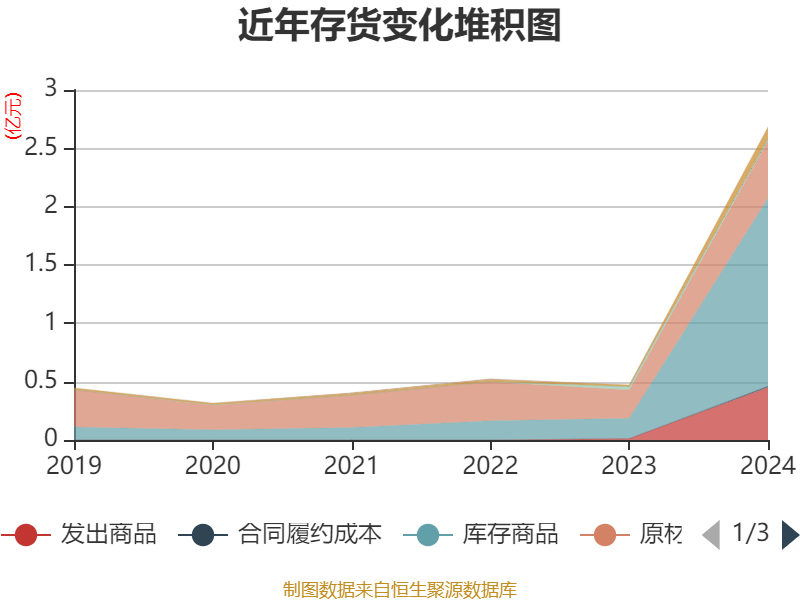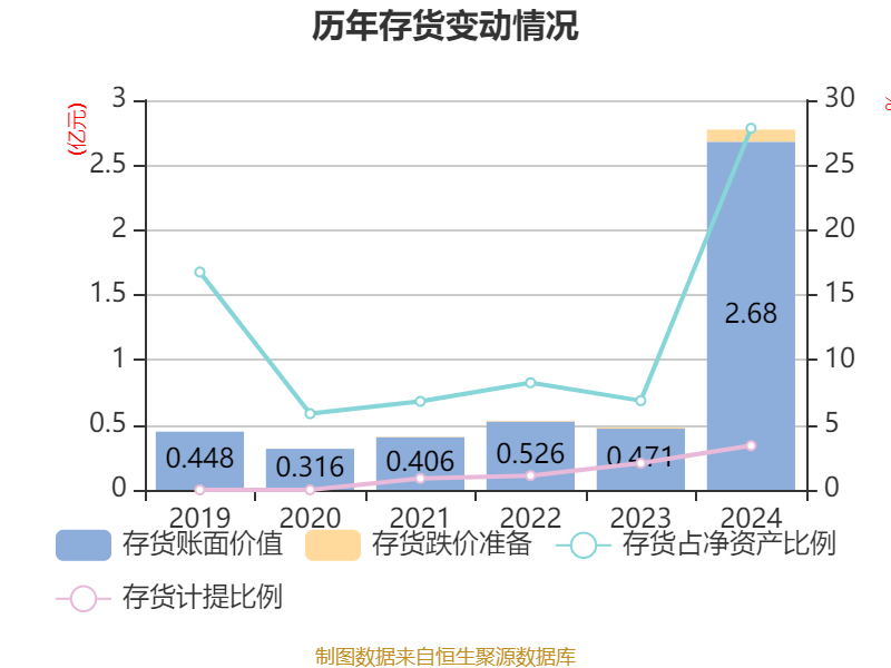 从存货变动来看,截至2024年末,公司存货账面价值为2.68亿元,占净资产的27.84%,较上年末增加2.21亿元。其中,存货跌价准备为944.14万元,计提比例为3.4%。