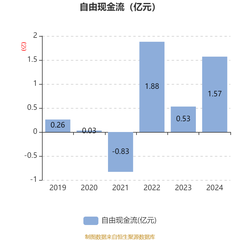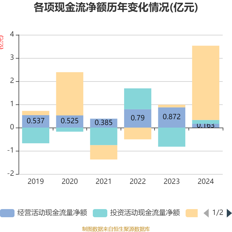 截至2024年,公司经营活动现金流净额为1632.87万元,同比下降81.27%;筹资活动现金流净额3.2亿元,同比增加3.09亿元;投资活动现金流净额1656.43万元,上年同期为-8220.37万元。