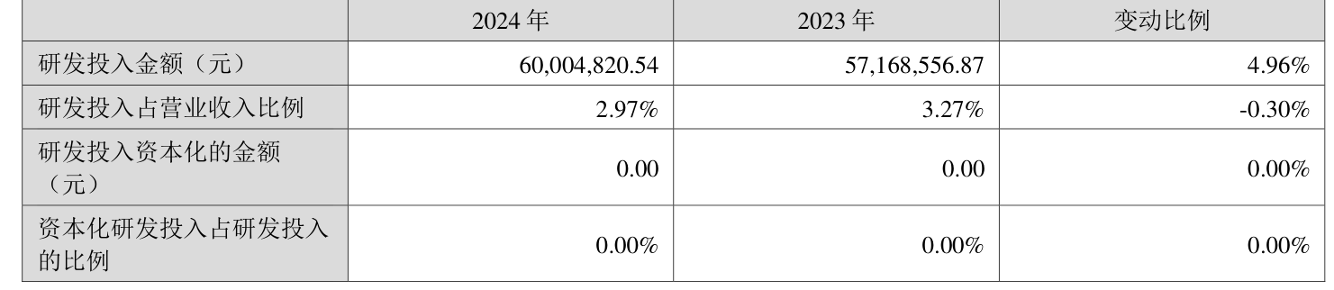 2024年全年,公司研发投入金额为6000.48万元,同比增长4.96%;研发投入占营业收入比例为2.97%,相比上年同期下降0.3个百分点。此外,公司全年研发投入资本化率为0%。