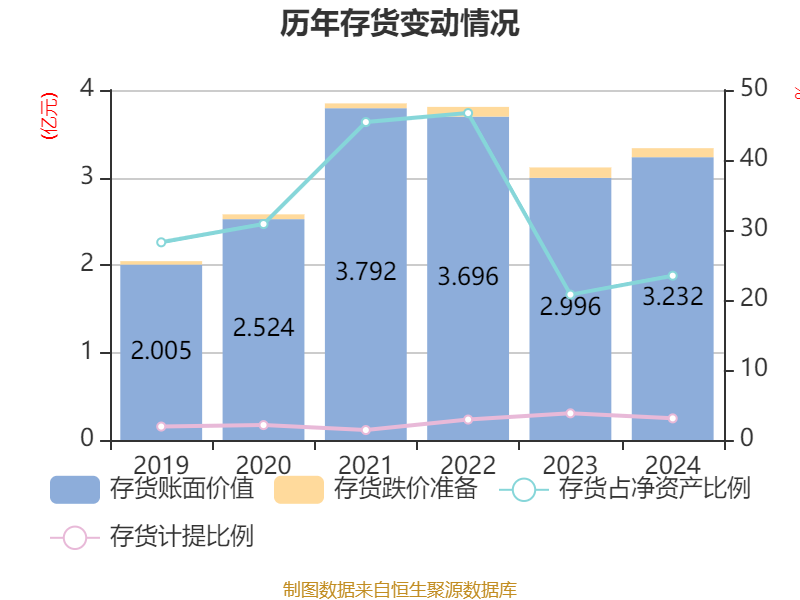 从存货变动来看,截至2024年末,公司存货账面价值为3.23亿元,占净资产的23.47%,较上年末增加2364.98万元。其中,存货跌价准备为1030.98万元,计提比例为3.09%。