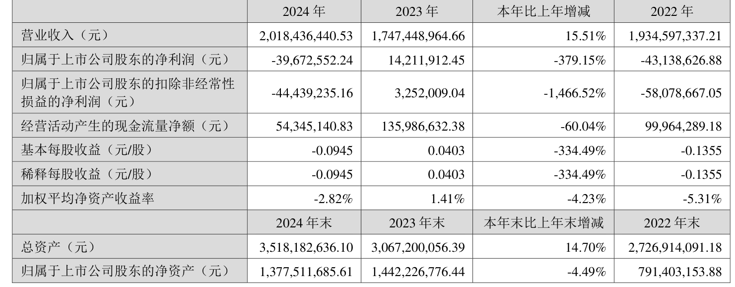 中证智能财讯英联股份(002846)4月18日披露2024年年度报告。2024年,公司实现营业总收入20.18亿元,同比增长15.51%;归母净利润亏损3967.26万元,上年同期盈利1421.19万元;扣非净利润亏损4443.92万元,上年同期盈利325.2万元;经营活动产生的现金流量净额为5434.51万元,同比下降60.04%;报告期内,英联股份基本每股收益为-0.0945元,加权平均净资产收益率为-2.82%。