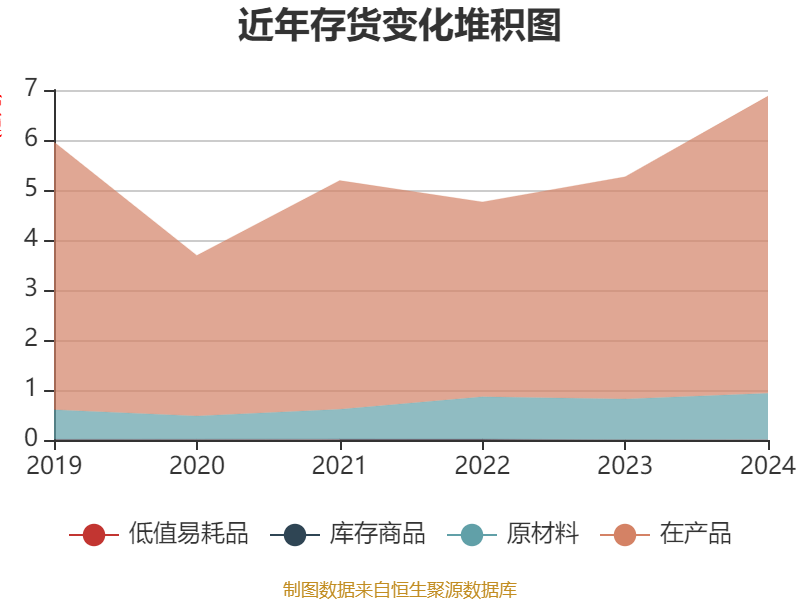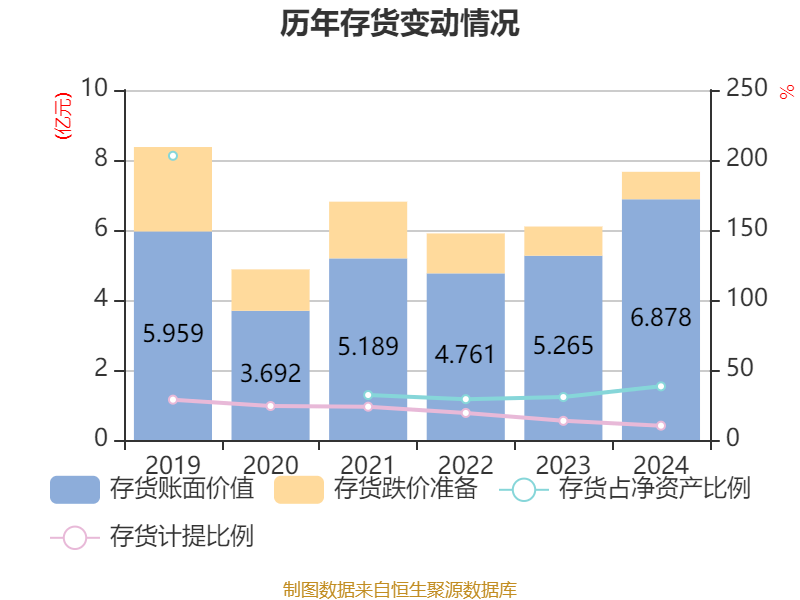 从存货变动来看,截至2024年末,公司存货账面价值为6.88亿元,占净资产的38.32%,较上年末增加1.61亿元。其中,存货跌价准备为7846.74万元,计提比例为10.24%。
