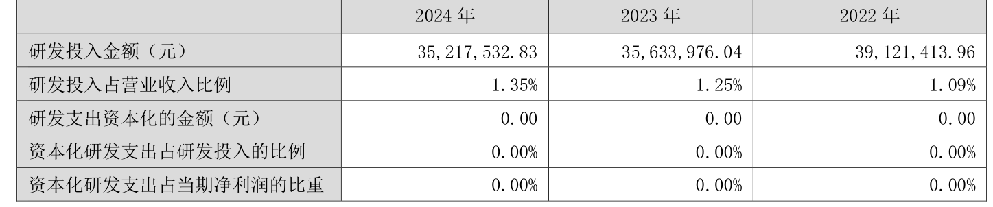 2024年全年,公司研发投入金额为3521.75万元,同比下降1.17%;研发投入占营业收入比例为1.35%,相比上年同期上升0.1个百分点。此外,公司全年研发投入资本化率为0%。