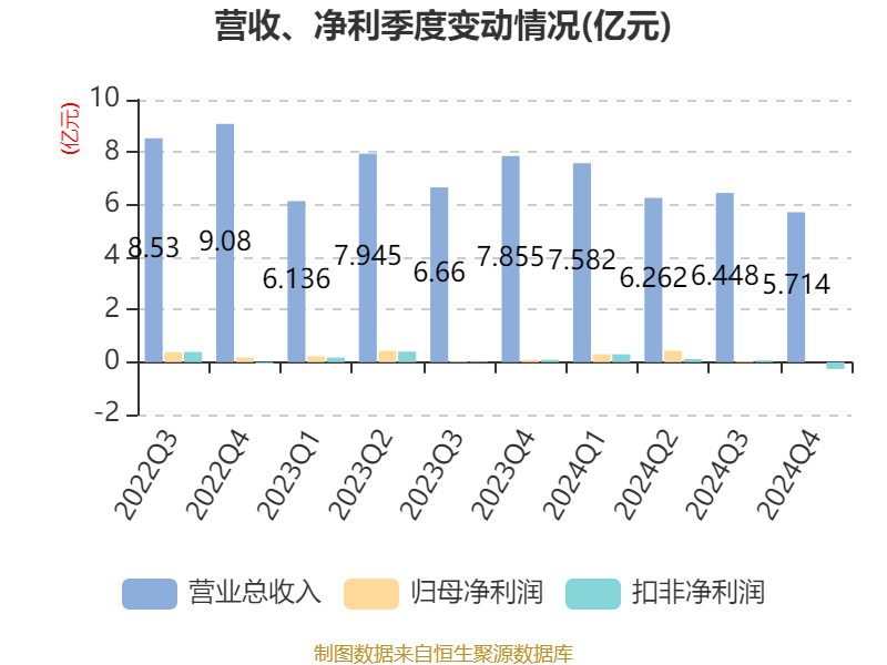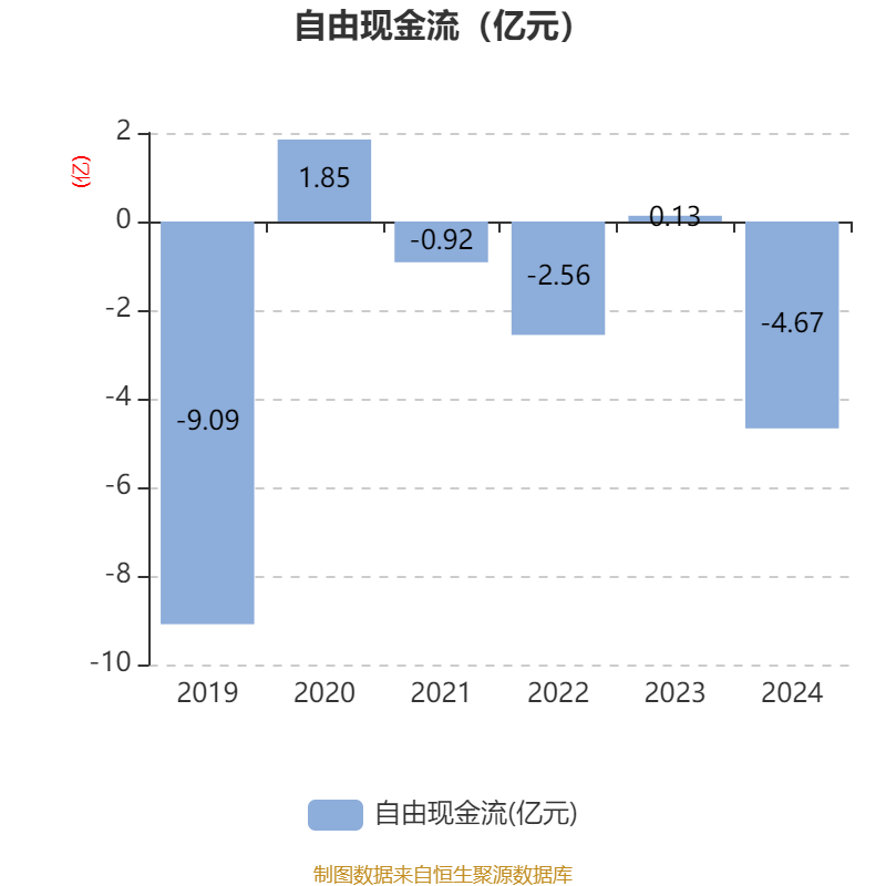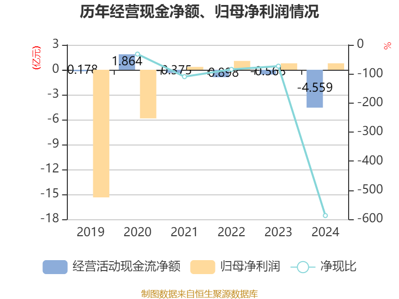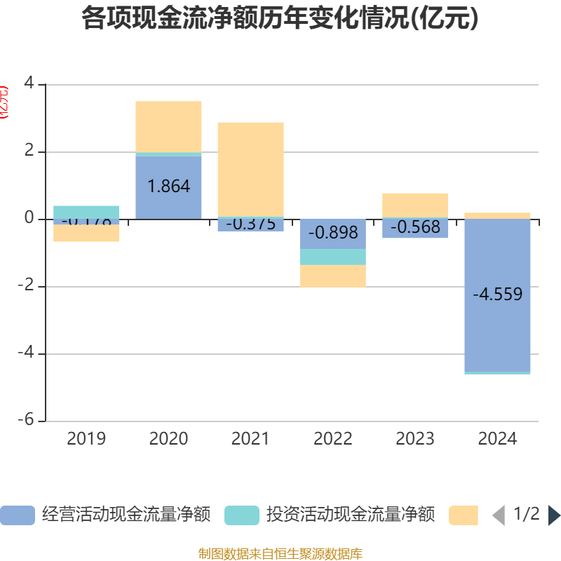 截至2024年,公司经营活动现金流净额为-4.56亿元,同比减少3.99亿元;筹资活动现金流净额1829.3万元,同比减少5268.86万元;投资活动现金流净额-659.05万元,上年同期为434.74万元。