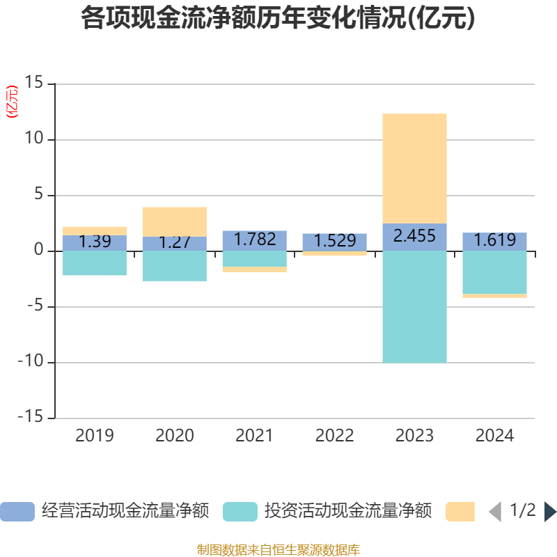 截至2024年,公司经营活动现金流净额为1.62亿元,同比下降34.07%;筹资活动现金流净额-3360.04万元,同比减少10.18亿元;投资活动现金流净额-3.9亿元,上年同期为-10.09亿元。